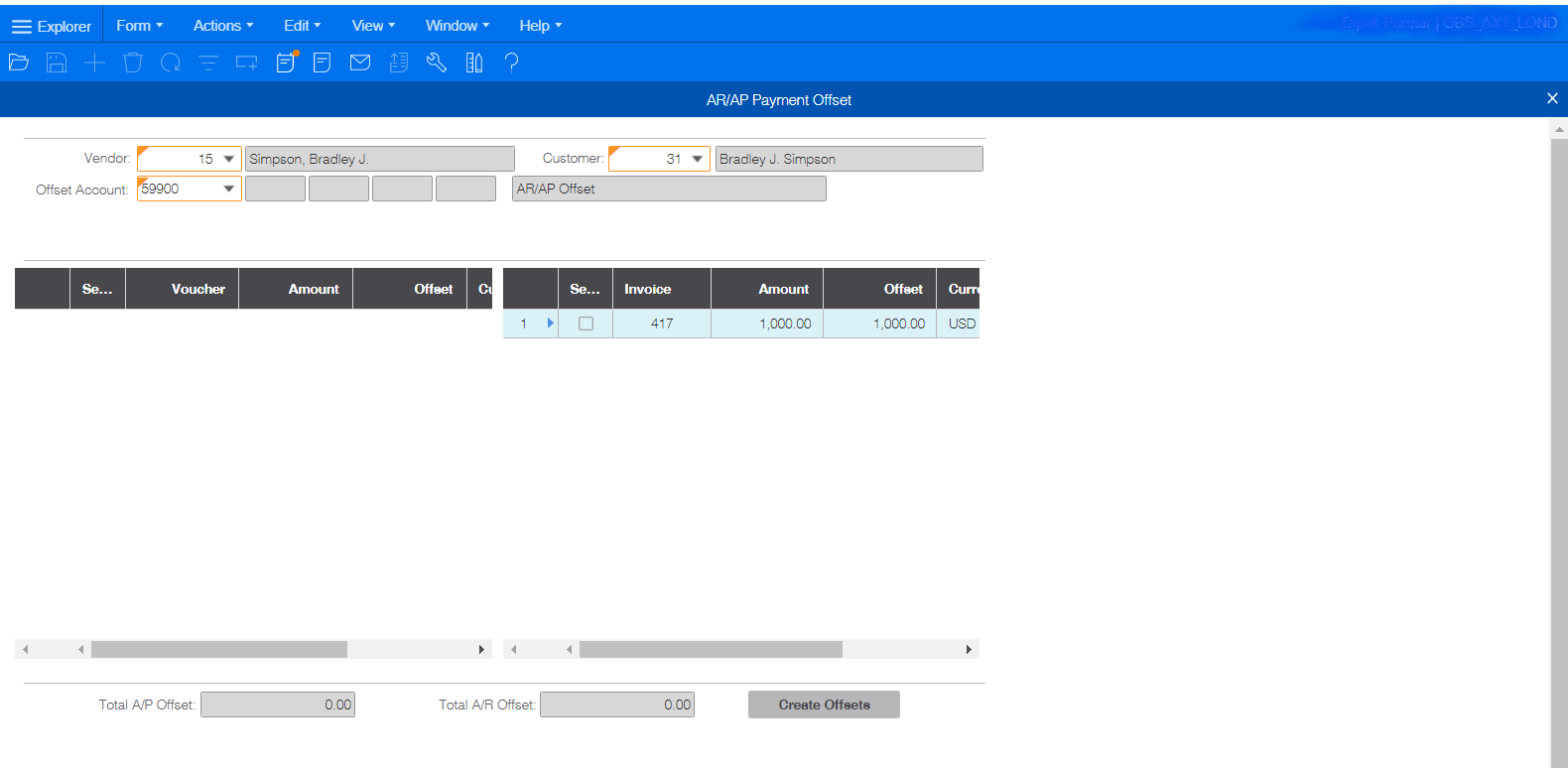 We would then be in a position to create the offsets and proceed with the A/R Payment Posting and A/P Check Printing/Posting forms.