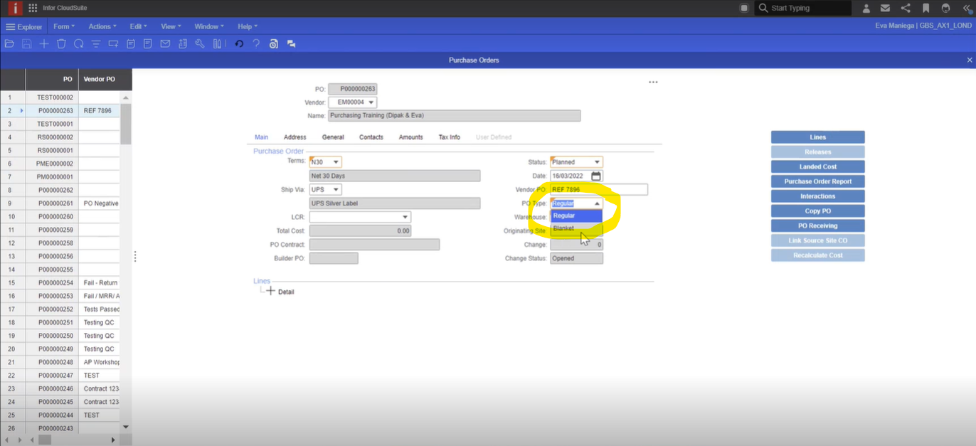 On the Purchase Order header screen ensure that you create the correct type of Purchase Order. - Regular or Blanket