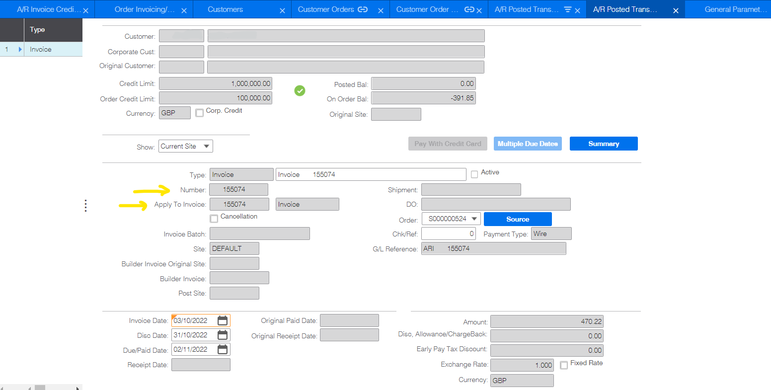 However, before this has been done please check the credit invoice is matched to the original invoice. - This is done by checking the AR Posted transactions detail for that Customer & Invoice No. as shown below: