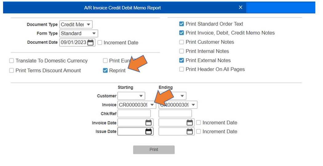 If you have manually raised a credit note from Invoices, Debit & Credit Memo Form and would like to print a Credit Invoice to reflect this this then is is done on the "A/R Invoice Credit Debit Memo Report" Form.