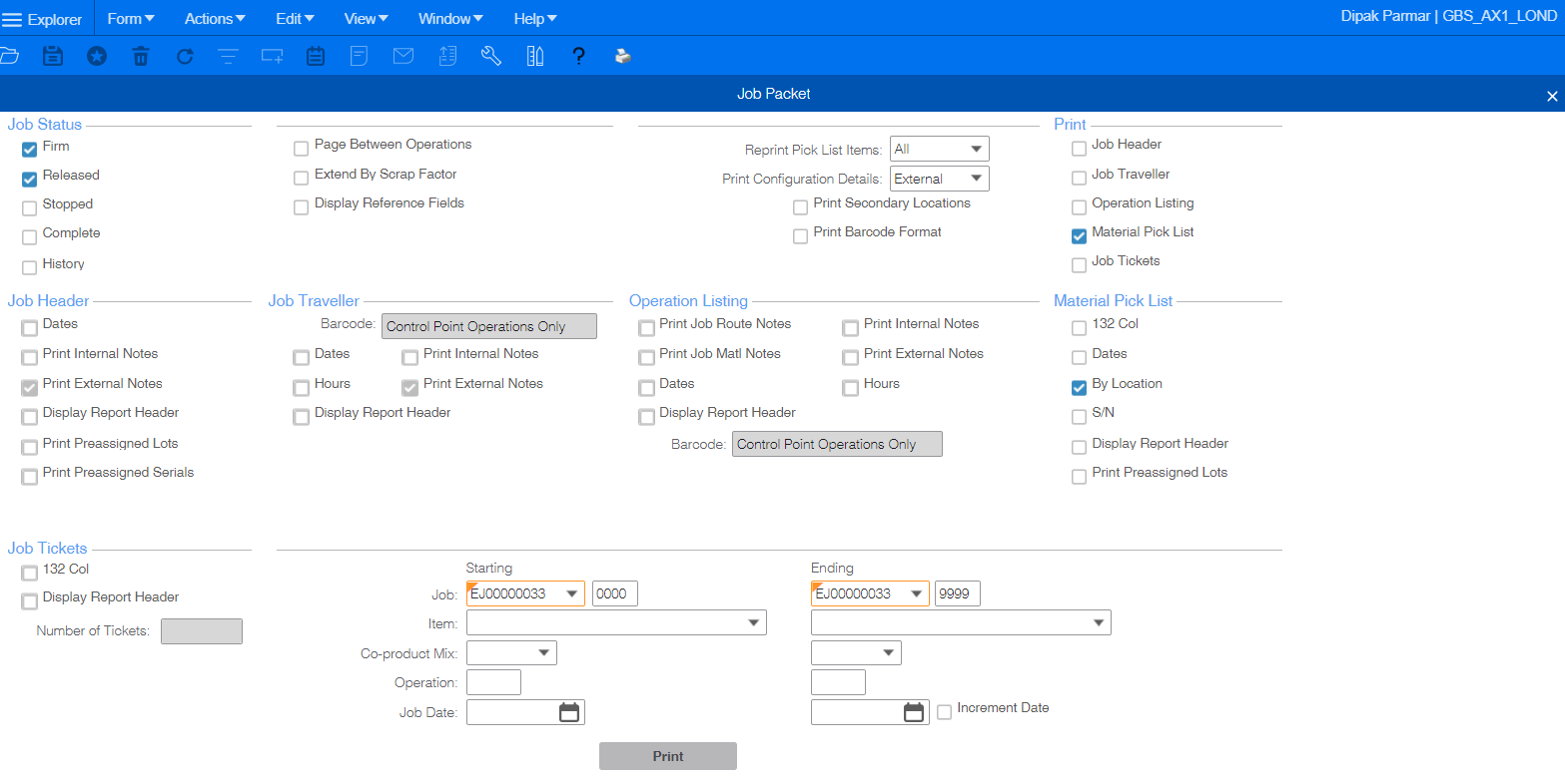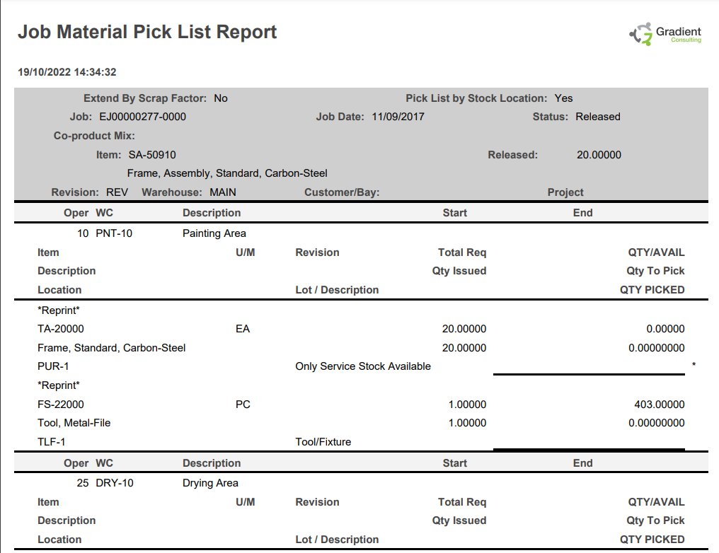 The Job Material Pick List report is run to identify all the items required for a specific manufacturing job.