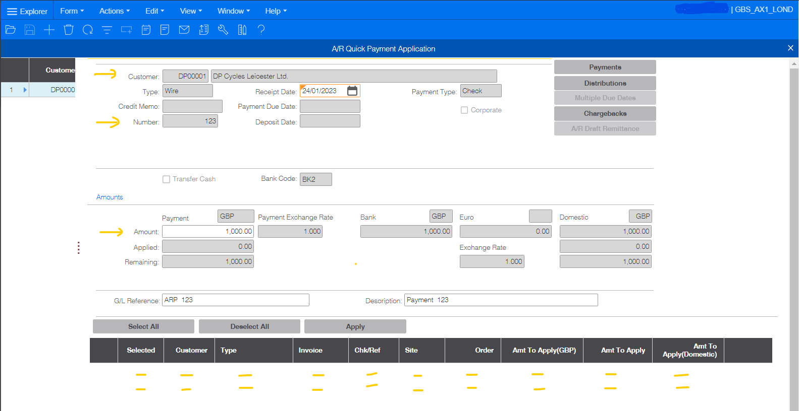 Open up the A/R Quick Payment Application Form, and select the the Customer by entering the Customer ID.