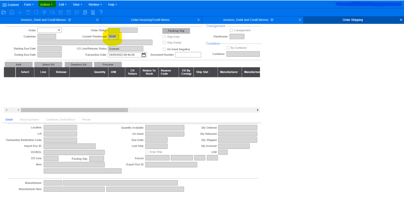 As default, the Order Shipping Screen points to the "Main" warehouse.