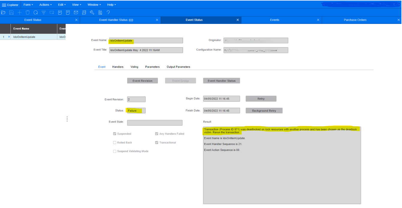 To view the view the status of the task you need to open up the "Event Status" form and locate the task - The PO Workflow happens to be an "idoOnItemupdate" task and filter on failures.